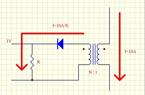 假定用電流互感器檢測變換器的原邊電流,原邊10A電流對應1V電壓。當然,咱們能夠用一個1V/10A=100mΩ的電阻來檢測,但是電阻將構成的損耗為1V×10A=10W,這么大的損耗對幾乎一切的規劃來說都是不能接受的。所以,要選用電流互感器,如圖1所示。