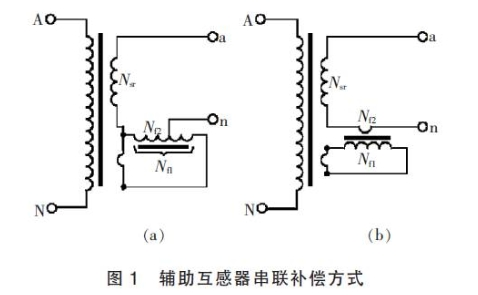 由主電壓互感器低壓側(cè)只需一匝的輔佐繞組給輔佐電壓互感器供電,接線原理圖如圖1所示,將這種補償辦法稱作串聯(lián)補償。
