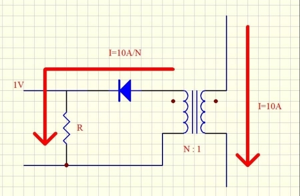 假定用電流互感器檢測(cè)變換器的原邊電流,原邊10A電流對(duì)應(yīng)1V電壓。當(dāng)然,咱們能夠用一個(gè)1V/10A=100mΩ的電阻來檢測(cè),可是電阻將構(gòu)成的損耗為1V×10A=10W,這么大的損耗對(duì)幾乎一切的規(guī)劃來說都是不能承受的。所以,要選用電流互感器,如圖1所示。